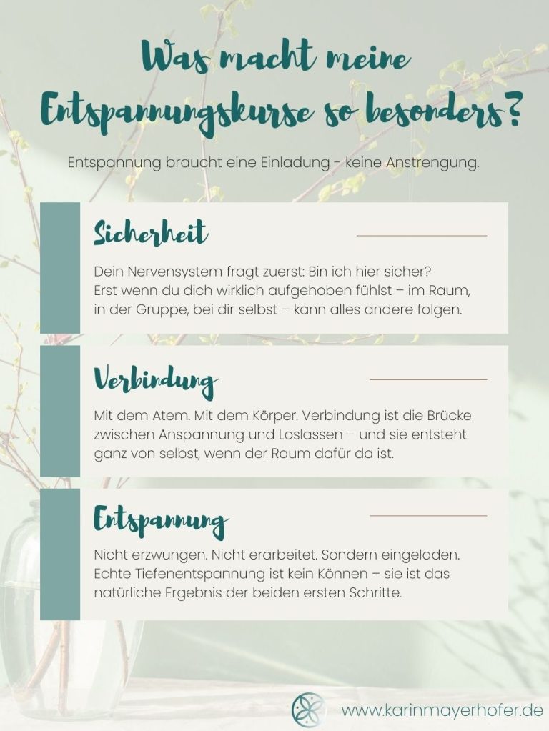 Echte Entspannung entsteht nicht einfach so – sie hat einen Weg. Zuerst braucht dein Nervensystem Sicherheit: das Gefühl, wirklich aufgehoben zu sein – im Raum, in der Gruppe, bei dir selbst. Es entsteht Verbindung: mit dem Atem, mit dem Körper, mit dem Moment. Dann darf tiefe Entspannung kommen.